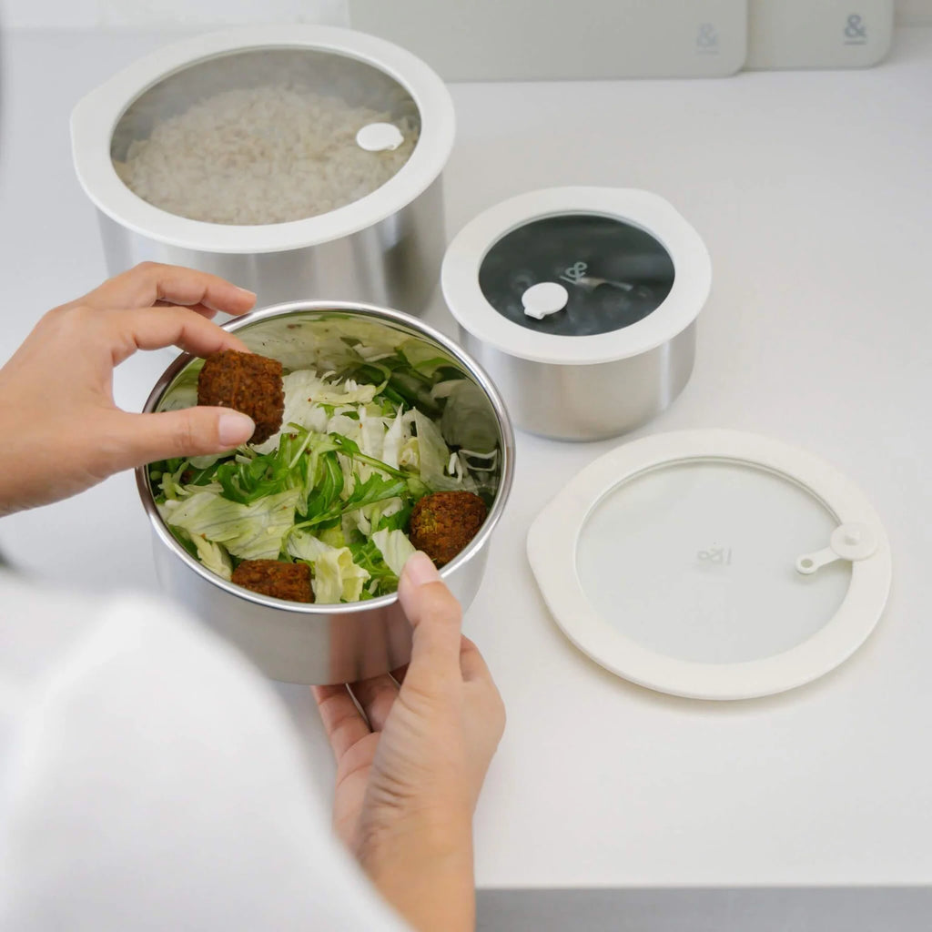 Made from 304 stainless steel, durable borosilicate glass and food-grade silicone. Designed to be a light, travel-friendly but sustainable swap for plastic containers.